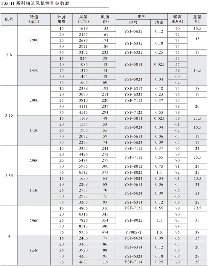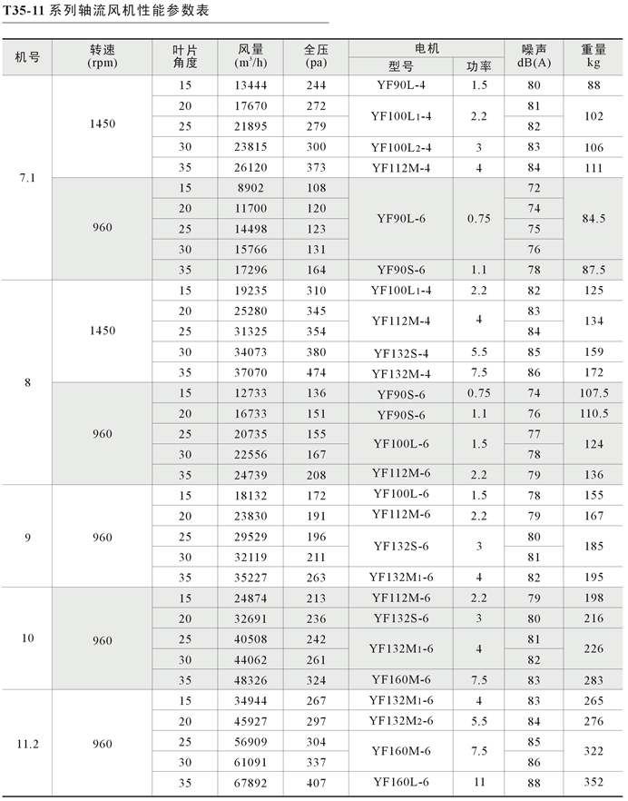 T35-11系列軸流風機是我國八十年代在30-11的基礎上改進設計的新型風機,它與30-11風機相比具有明顯優點:①結構更合理:輪轂圓筒形,減少流動損失,葉片根部強度高;②性能有較大的提高;全壓效率為89.5%,噪聲(比A聲級)降低3.6dB(A)。