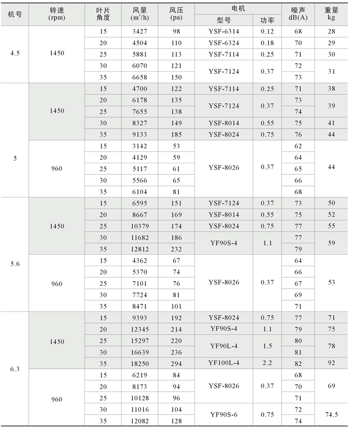 本系列風機葉輪直徑由小到大共有十三個規格,每一規格風機的葉片數都為4片。
